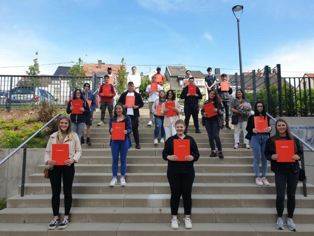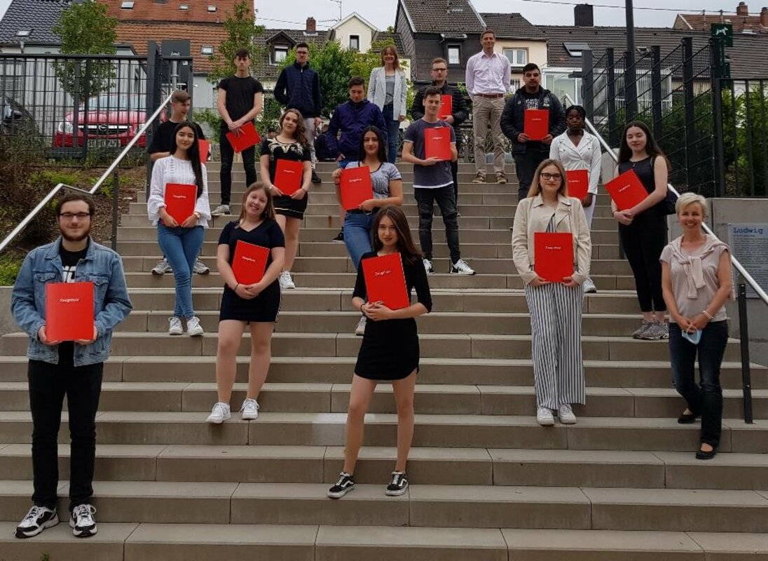 In der Handelsschule wurden 37 Absolventen und Absolventinnen zu ihrem Abschluss von Abteilungsleiter Stefan Bubel sowie von den Klassenlehrerinnen Laura Adler und Natascha Knaul beglückwünscht. Die Klassenbesten Sevin Özdemir (HS 11.1) und Yunus-Emre Sarac (HS 11.2) wurden zusätzlich geehrt und mit einem kleinen Präsent bedacht.
